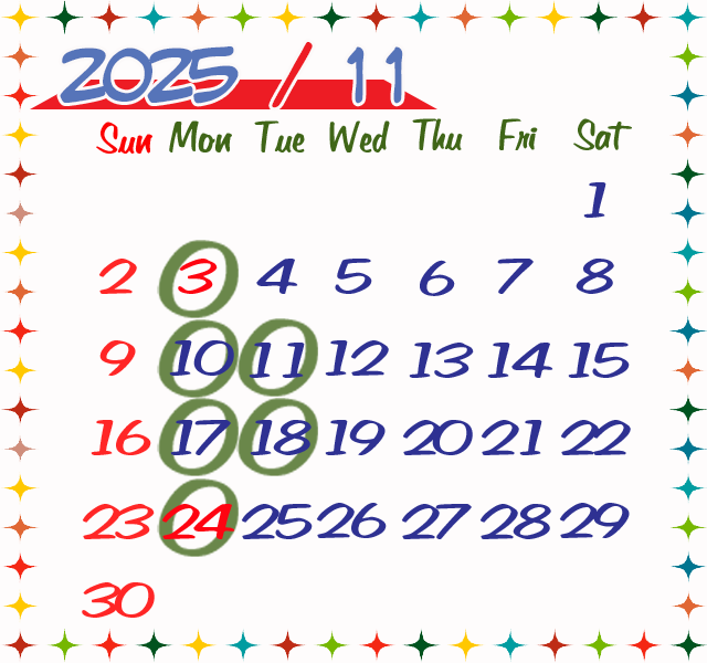 毎週月曜日、11日(火)・18日(火)が休業日です。